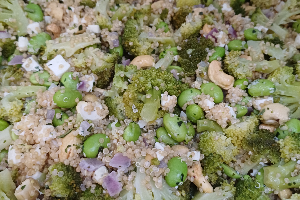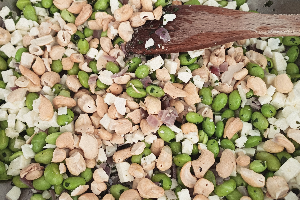 Faites revenir l'oignon avec l'huile d'olives puis ajoutez les fèves d'edamame et les noix de cajou grossièrement concassées.