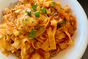 Ajoutez l’eau de cuisson réservée et les tagliatelles à la sauteuse.
