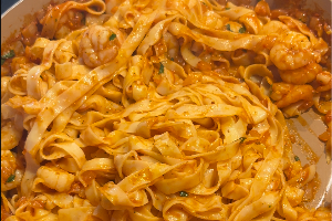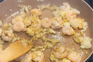 Faites chauffer un filet d’huile d’olive dans une sauteuse. Ajoutez-y les crevettes, l’oignon, l’ail et du paprika (selon vos goûts). Faites cuire le tout 2-3 min, puis déglacez avec le vinaigre.