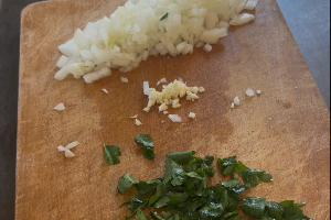 Ciselez l’oignon et l’ail. Effeuillez et ciselez le persil.