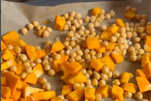 Sur une plaque de cuisson recouverte de papier sulfurisé, mélangez les dés de potimarron avec les poichiches égouttés avec un filet d'huile d'olive.