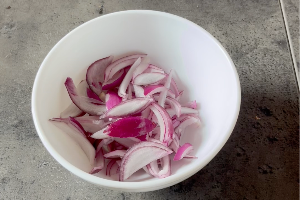 Coupez l'oignon en fine demi-lunes et le mélangez avec une cuillère à café de vinaigre et du sel.